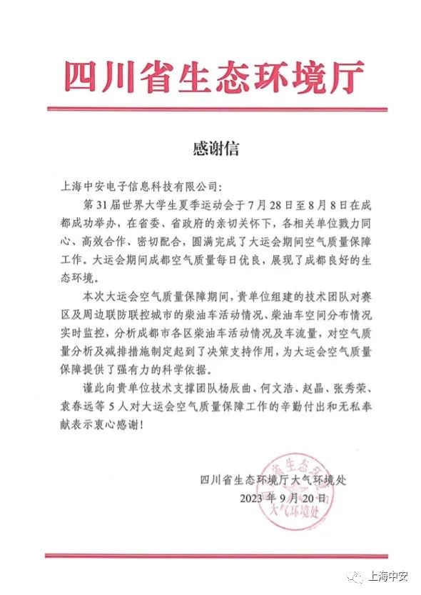 上海市生態環境局致上海中安的一封感謝信?。?025-01-10)
